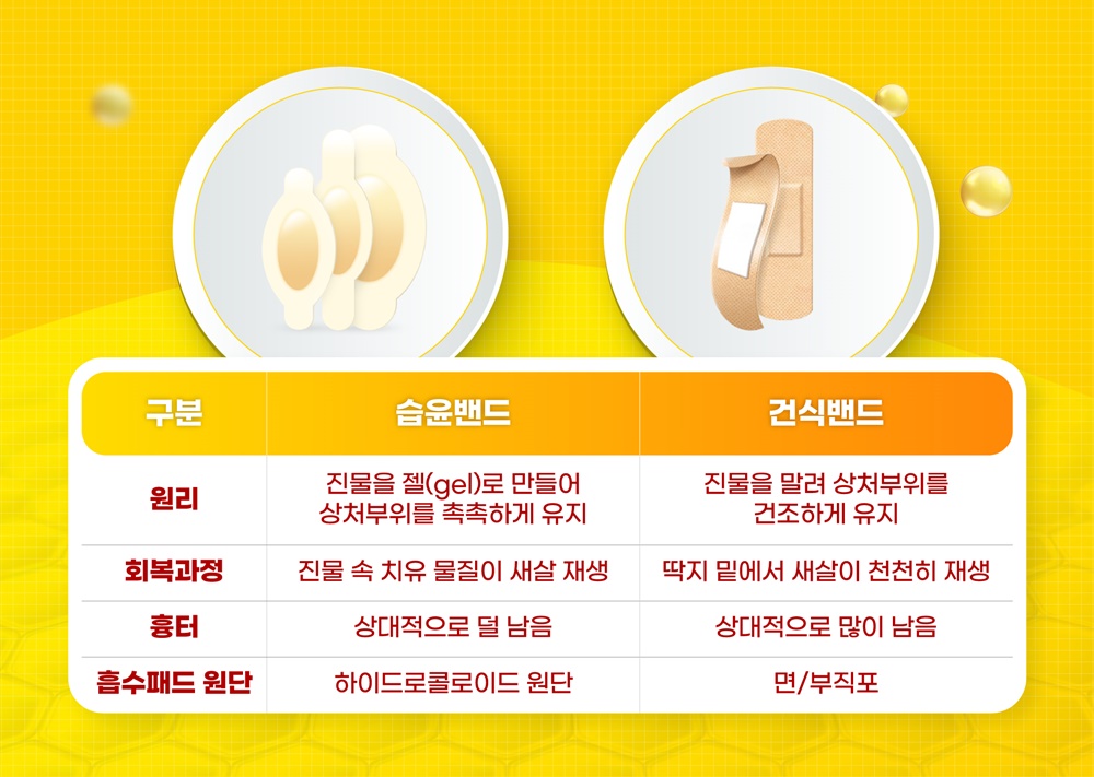 반면 ‘습윤치료’는 삼출물을 젤(gel)로 바꿔 상처를 촉촉하게 유지하는 방식인데요. 젤층은 상처를 보호하면서 세균을 차단하고, 별도의 연고 없이도 치유를 도와줘요. 딱지가 생기지 않아 새살이 곧바로 돋아나므로 흉터도 최소화되죠.