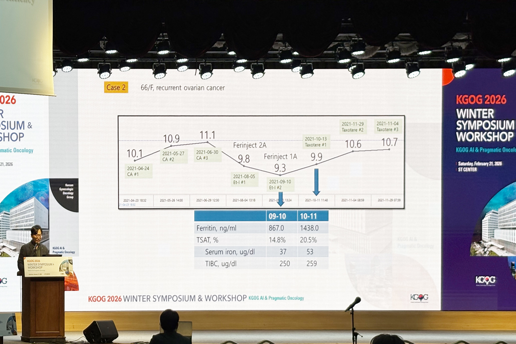 이 교수는 미국종합암네트워크(NCCN) 가이드라인을 근거로 “부인암 환자는 페리틴(Ferritin) 수치가 높아도 트랜스페린 포화도(TSAT)가 낮은 경우가 많아 기능성 철결핍 감별이 필요하다”며 “이러한 경우 헵시딘 증가 등으로 경구 철분제 반응이 제한적일 수 있어 철분주사제 투여를 통한 교정이 임상적으로 도움이 될 수 있다”고 설명했다.